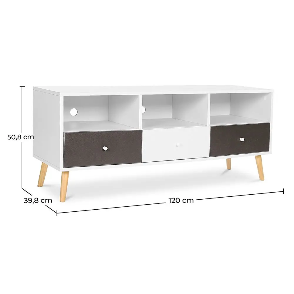 Dzięki trzem wnękom i trzem szufladom, ten skandynawski kredens pod telewizor oferuje dużo miejsca do przechowywania.