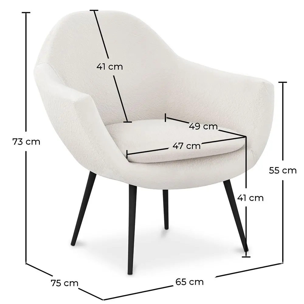 Uwielbiamy ten inspirowany stylem mid-century fotel z długimi czarnymi metalowymi nogami i białą tapicerką z pluszowego polaru. Ten fotel z poduszką na siedzisku jest idealny do czytania lub relaksu, a jednocześnie dodaje dekoracyjny akcent do wnętrza. To naprawdę stylowy mebel.