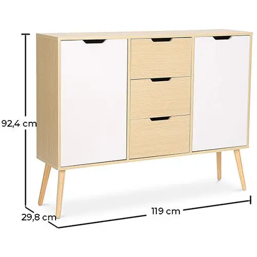 Ten wspaniały skandynawski kredens wykonany jest z wysokiej jakości drewna i składa się z 3 dużych szuflad i dwóch drzwiczek po bokach. Ten drewniany kredens wyróżnia się nie tylko dużą pojemnością, ale także pięknym designem, który łączy biel z naturalnym drewnem.