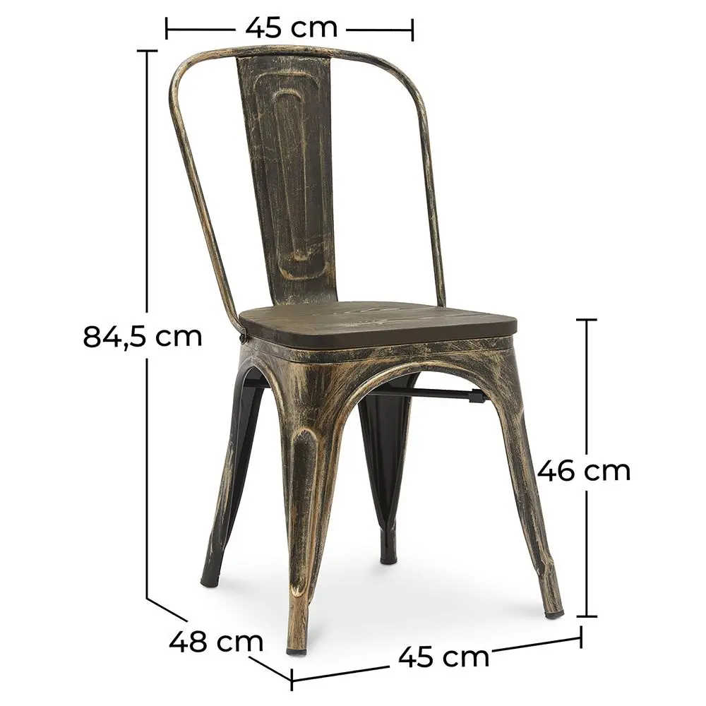 Klasyczne, nowoczesne krzesło do jadalni w stylu industrialnym. To słynne krzesło inspirowane stylem Stylix, wykonane ze stali i drewna. Model ten posiada siedzisko z ciemnego drewna, co zwiększa jego komfort i praktyczność. To mebel, którego potrzebuje każdy, kto chce urządzić wnętrze w stylu bistro. Idealny do barów, kawiarni, restauracji lub wnętrz domowych.