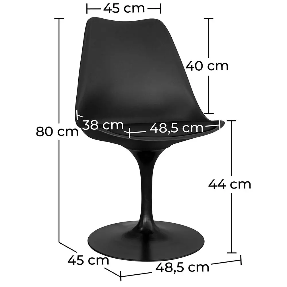 Przedstawiamy mityczne czarne krzesło Tulipan w tańszej wersji, ale z taką samą wysoką jakością jak zawsze. To krzesło obrotowe wykonane jest z siedziska z PP i solidnej stalowej nogi pomalowanej na czarno. Poduszka jest tapicerowana imitacją skóry, a jej miękka pianka zapewnia duży komfort. Wytrzymałe, czarne krzesło Tulipan będzie wyglądać idealnie w każdym stylu salonu.