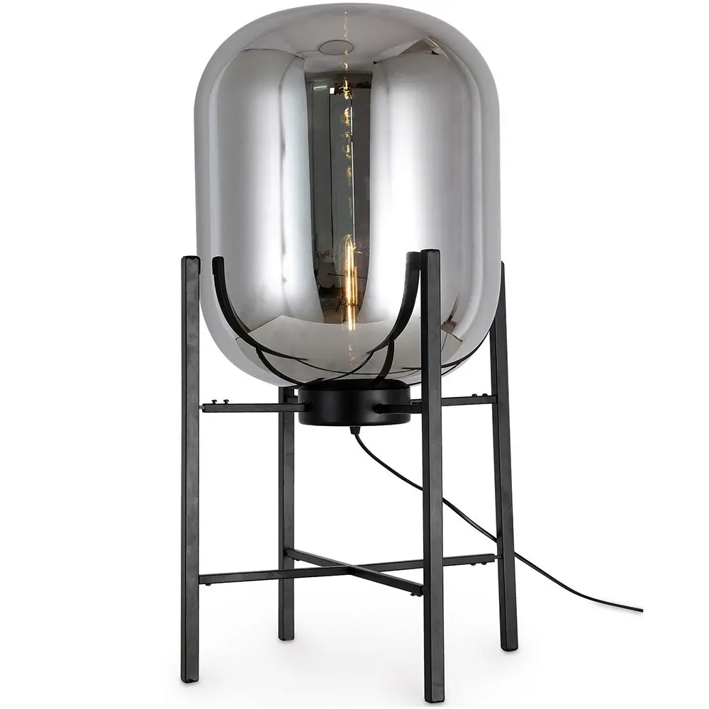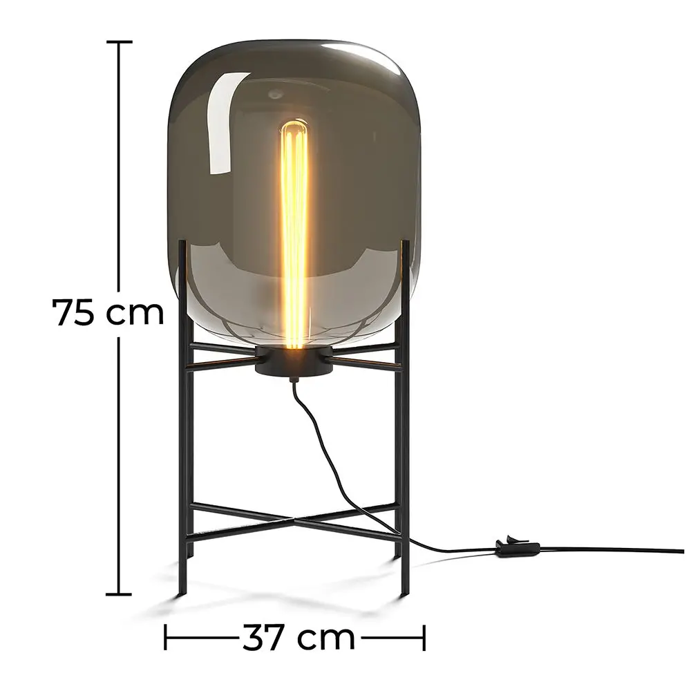 Ta szklana lampa podłogowa jest idealna do każdego zakątka domu. Szklany klosz w kształcie balonu jest dostępny w wariantach z bursztynowego i przydymionego szkła, z wydłużoną żarówką. Całość spoczywa na czteronożnej czarnej metalowej konstrukcji. Lampa rzuca miękkie światło i tworzy spokojną atmosferę.