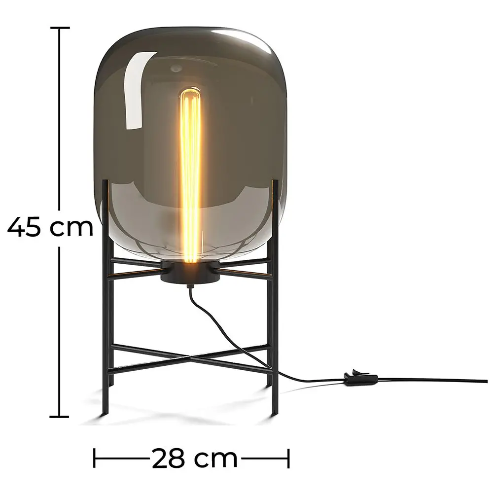 Ta szklana lampa stołowa tworzy miękką, otaczającą poświatę dzięki bursztynowemu przydymionemu szkłu i wydłużonej żarówce. Rama ma cztery smukłe metalowe nogi. Do umieszczenia na stołach, stolikach bocznych, aby dodać wymiar do sypialni, salonu.