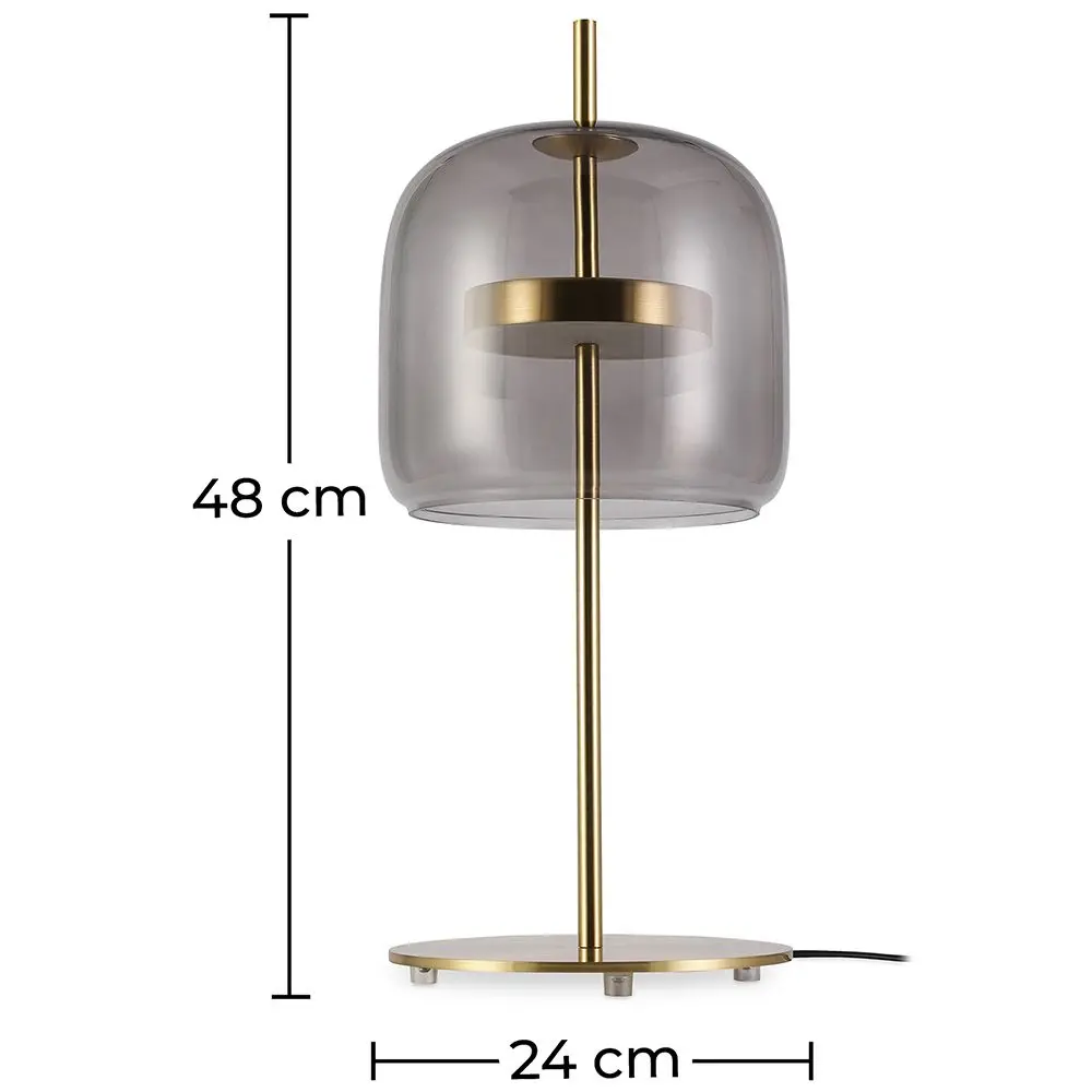 Każdy, kto szuka designerskich opraw oświetleniowych z preferencją dla unikalnej, nowoczesnej stylistyki, nie musi szukać dalej. Ta wspaniała lampa stołowa ma ekscytujący szklany klosz o przydymionym wyglądzie. Pozwala to na uzyskanie delikatnej atmosfery, a jednocześnie umożliwia prześwitywanie światła w celu oświetlenia. Stojak w złotym kolorze jest elegancki i elegancki, a klosz jest idealnie ustawiony, aby zapewnić użyteczne źródło światła. Klosz w kształcie kopuły natychmiast przyciąga wzrok, zwracając uwagę na delikatny blask. Średnica 24 cm i praktyczna wysokość 48 cm sprawiają, że jest to idealna lampa stołowa do każdego pomieszczenia.