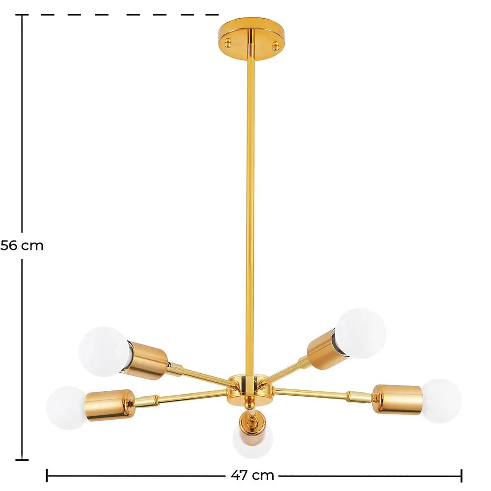Ta oprawa oświetleniowa zwisa z sufitu. Jest to lampa wisząca z mosiężną konstrukcją i 5 żarówkami pochodzącymi z tego samego źródła. Może być centralnym elementem pokoju, który dodaje światła, klasy i elegancji. Idealna do przedpokoju, salonu lub nad stół w jadalni.
