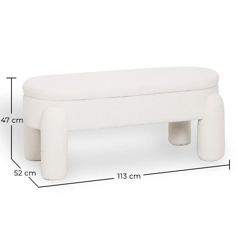 Solidna konstrukcja i wysokiej jakości wykończenie bouclé dodają elegancji i ciepła, idealnie dopasowując się do salonów, sypialni czy przedpokojów. Oprócz funkcji przechowywania, ta ławka staje się wygodnym i dekoracyjnym dodatkowym siedziskiem dla każdego wnętrza.
