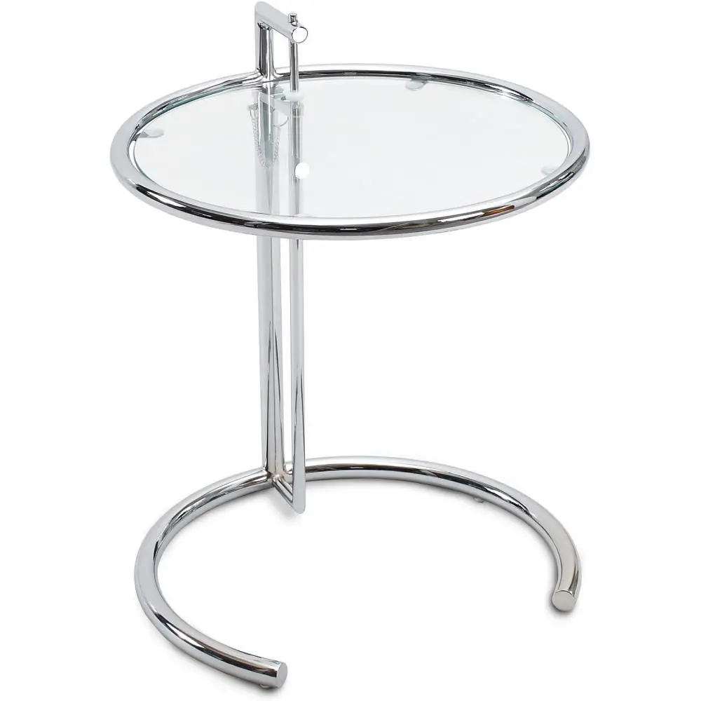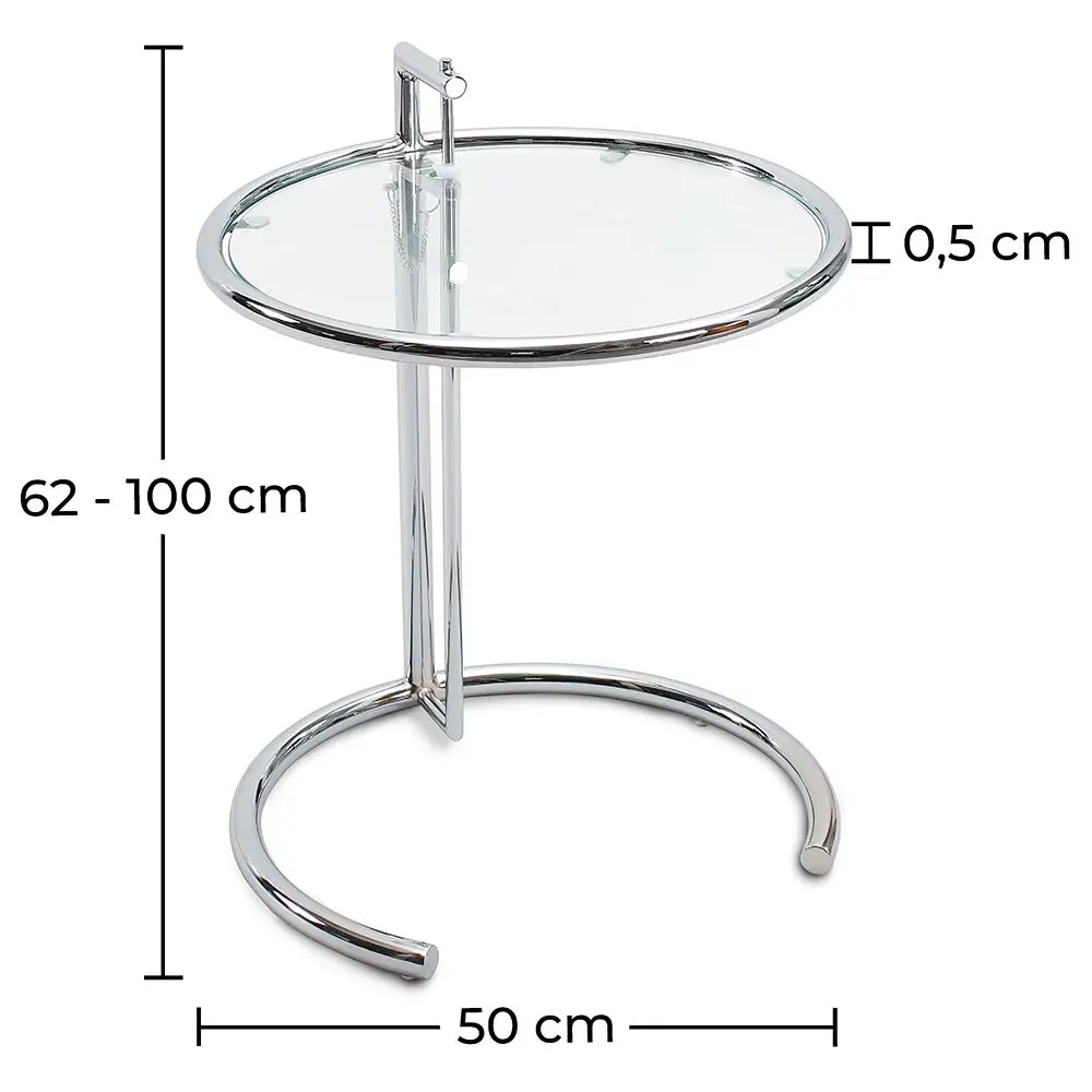 Okrągły stolik boczny - szkło i stal - Lake Oto klasyk wśród klasyków: stolik okolicznościowy L1027 Adjustable Table. Dzięki genialnie zaprojektowanym proporcjom, regulowanej wysokości i oryginalnemu kształtowi, stolik ten był jednym z najpopularniejszych dzieł XX wieku. Nazwa pochodzi od nadmorskiego domku L1027 zbudowanego dla niej i jej partnera, Jeana Badovici. W rzeczywistości nazwa jest tajnym kodem: E jak Eileen, 10 jak Jean (J to 10 litera alfabetu), 2 jak B (Badovici) i 7 jak G (Gray). Jego konstrukcja wykonana jest ze stali nierdzewnej, a blat ze szkła.