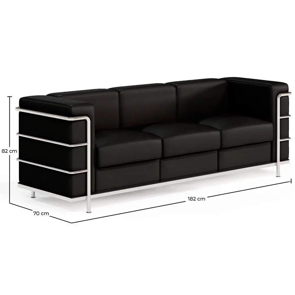 Ta designerska sofa łączy elegancję eko-skóry z siłą i trwałością solidnej metalowej ramy, tworząc wszechstronny i wyrafinowany mebel. Wysokiej jakości obicie z eko-skóry oferuje podobny wygląd jak prawdziwa skóra, dodając nutę wyrafinowania do każdego otoczenia. Dodatkowo, eko-skóra jest łatwa do czyszczenia i odporna na zużycie, zapewniając, że sofa zachowa swój nieskazitelny wygląd przez długi czas. Metalowa struktura naszej sofy Lecur nie tylko zapewnia dużą stabilność, ale również nadaje jej nowoczesny i elegancki wygląd. Solidny metal gwarantuje trwałość tej 3-osobowej sofy, nawet w miejscach o dużym natężeniu ruchu, takich jak biura, hotele i poczekalnie z ciągłym przepływem osób.