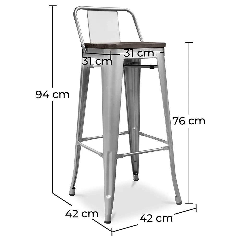 Ciesz się doskonałym połączeniem komfortu i stylu z taboretem Metalix wyposażonym w oparcie i ciemne naturalne drewniane siedzisko. Z wysokością siedziska 76 cm od podłogi, jest idealny do wysokich barów, wysp kuchennych lub przestrzeni hotelarskich poszukujących autentycznego i wyrafinowanego industrialnego wyglądu.