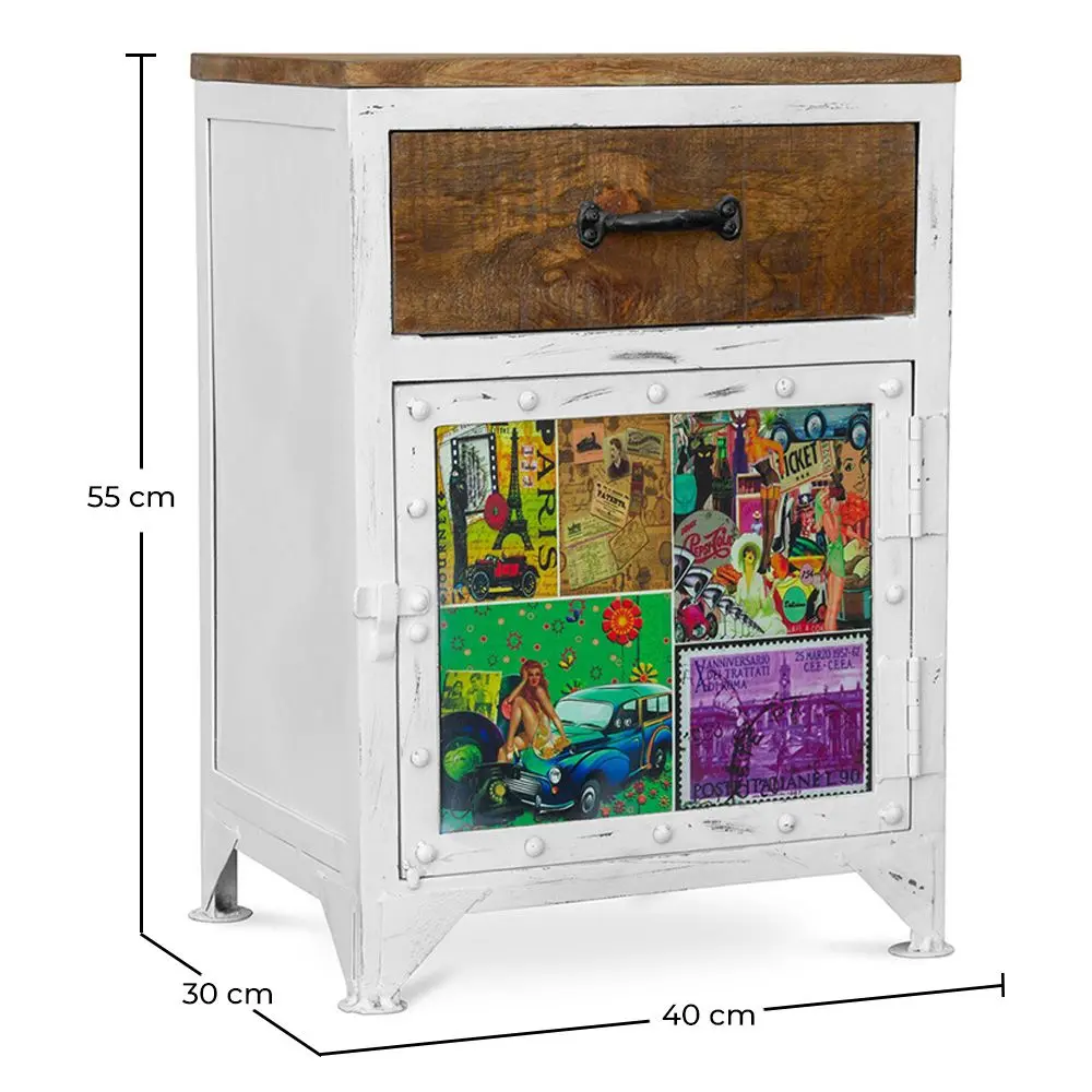 Ten biały stolik nocny to prawdziwy klejnot z drewna i stali. Posiada kolorowe wzory po bokach, które mogły zostać namalowane ręcznie. Wygląda jak przedmiot, który znalazłbyś na wyprzedaży garażowej i który odnowiłbyś z największym smakiem. To łóżko sprzymierza industrialny design i styl retro i rozweseli zarówno Twoją sypialnię, jak i sypialnię jednego z Twoich dzieci. Nie przegap wyjątkowego uroku tego mebla!