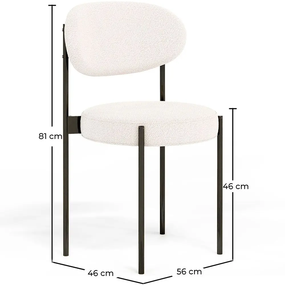 Krzesło do jadalni Margot to elegancki mebel, który doskonale łączy styl i komfort. Z nowoczesnym designem i starannie przemyślanymi detalami to krzesło z pewnością przyciągnie uwagę zarówno w domach, jak i przestrzeniach publicznych, hotelach, restauracjach... Połączenie czarnej metalowej ramy z obiciem z tkaniny bouclé tworzy ciekawy i zrównoważony kontrast, dodając odrobinę nowoczesności i wyrafinowania do Twojego obszaru jadalni. Ergonomiczne oparcie tego krzesła do jadalni z obiciem z tkaniny bouclé zostało zaprojektowane, aby zapewnić doskonałe wsparcie lędźwiowe, pozwalając na wygodne siedzenie przez długie okresy.